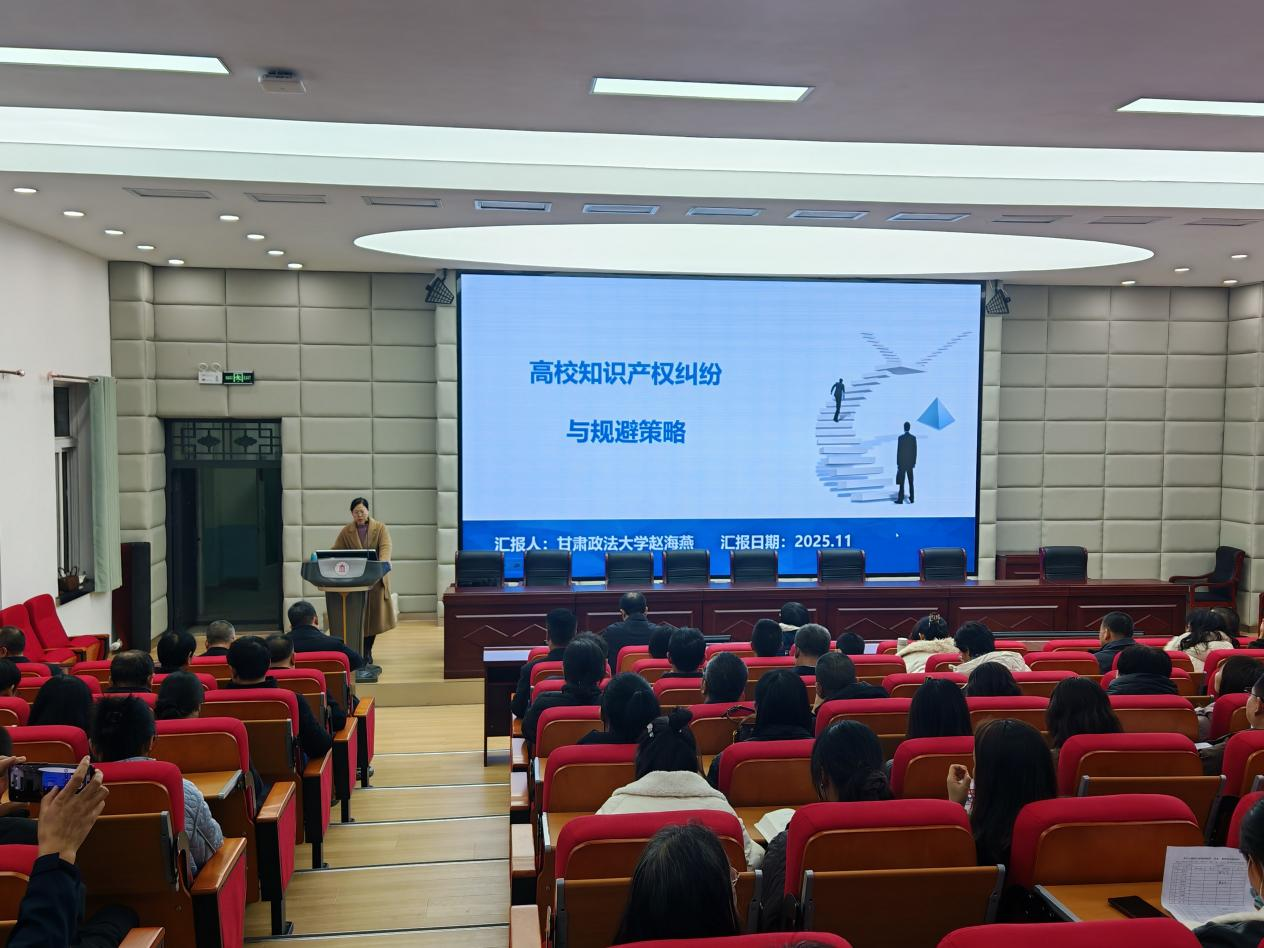 11月25日晚,我校特邀甘肃政法大学赵海燕教授在育心楼116报告厅作了题为“高校知识产权纠纷与规避策略”的专题报告。报告会由科研外事处负责人王瀚教授主持,各二级学院140余名教师参加。