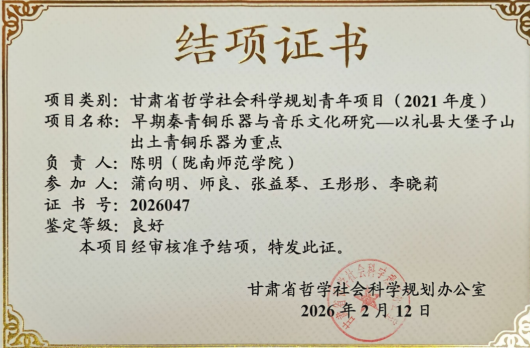 近日,我校音乐与舞蹈学院副教授陈明主持的甘肃省哲学社会科学规划青年项目《早期秦青铜乐器与音乐文化研究—以礼县大堡子山出土青铜乐器为重点》(批准号:2021QN040)顺利通过甘肃省哲学社会科学规划办公室审核,正式结项(证书号:2026047)。