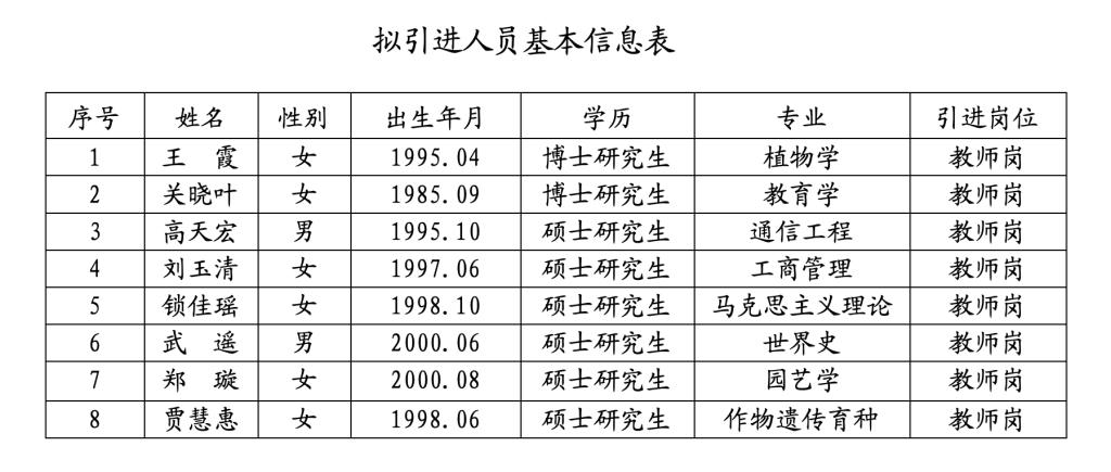 根据《陇南师范学院2025年第二批高层次人才和急需紧缺专业技术人才引进公告》,经发布公告、个人报名、资格审查、面试考核、考察、体检等环节,学校研究同意,确定王霞等8人为拟引进人员。现将拟引进人员予以公示(见下表),请社会各界监督。