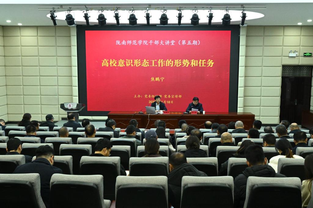 11月18日,我校举办2025年基层党组织书记培训班第四场专题报告会暨第5期干部大讲堂。学校党委副书记焦鹏宁作了题为“全面落实意识形态工作责任制 有效维护高校领域意识形态安全”的专题辅导报告。处室党员干部代表、学校基层党组织书记,部分新任职干部180余人聆听了报告。