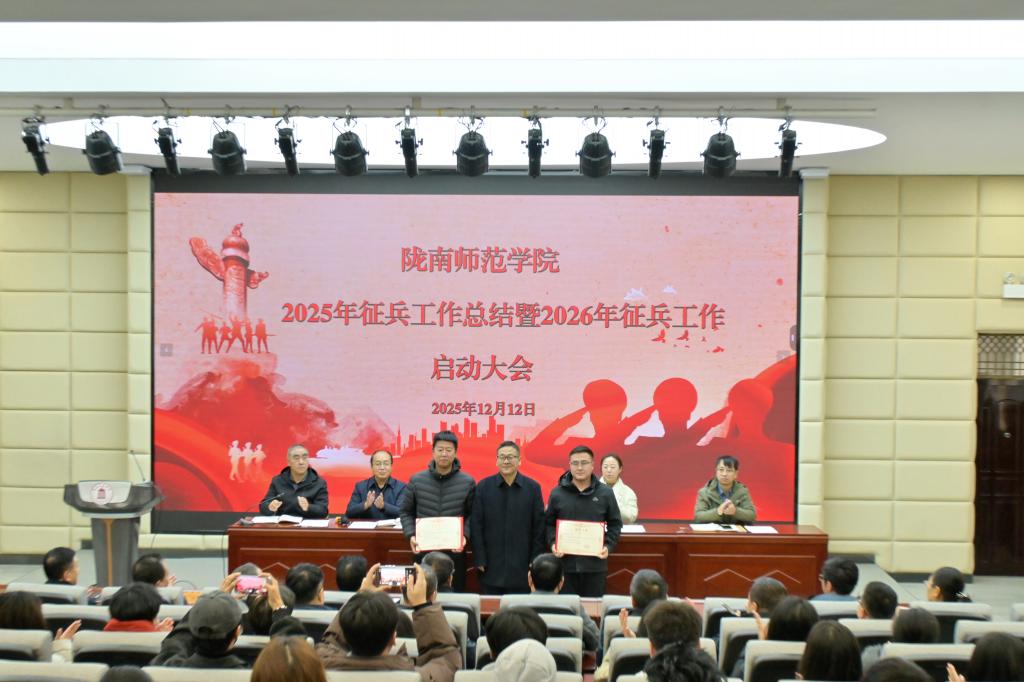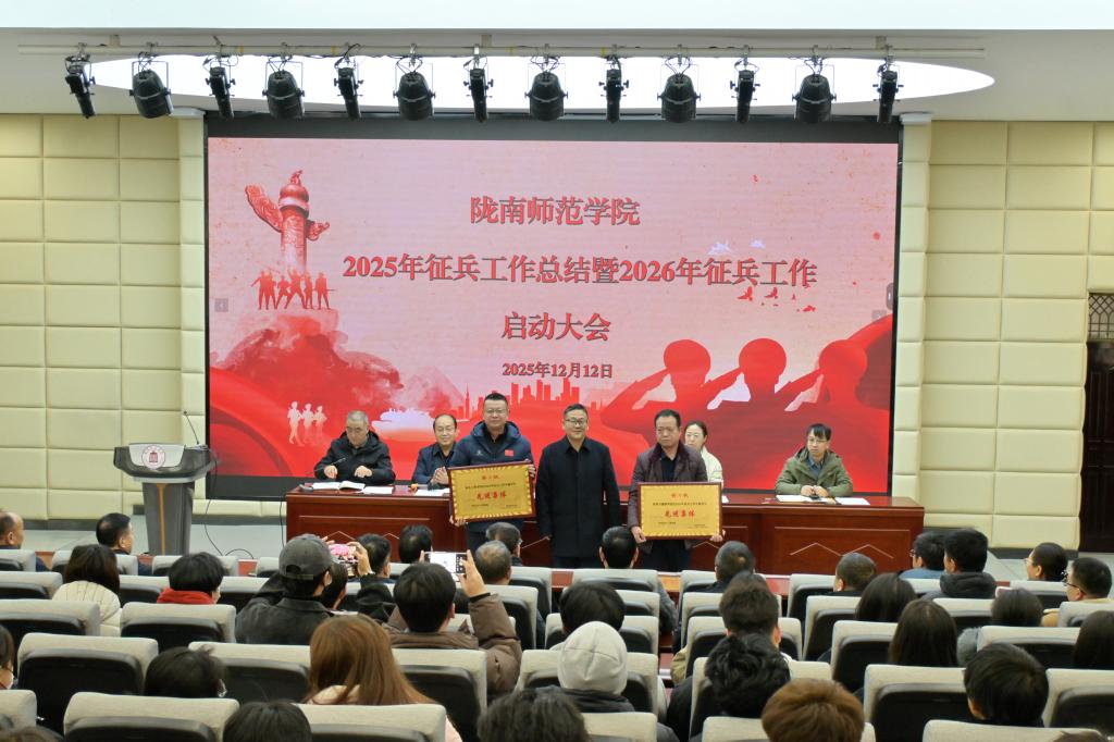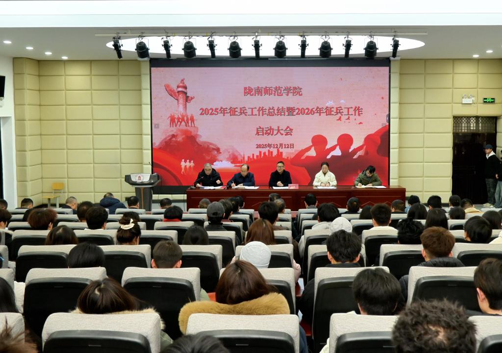12月12日下午,我校召开2025年征兵工作总结暨2026年征兵工作启动大会。副校长镡旭东出席并讲话,党委宣传部、学生工作部、教务处、团委等部门负责人,各学院党总支书记、分管学生工作领导,学院征兵专人,迷彩青春国防教育社及23级和24级学生代表参加会议。会议由党委学生工作部部长李晓江主持。