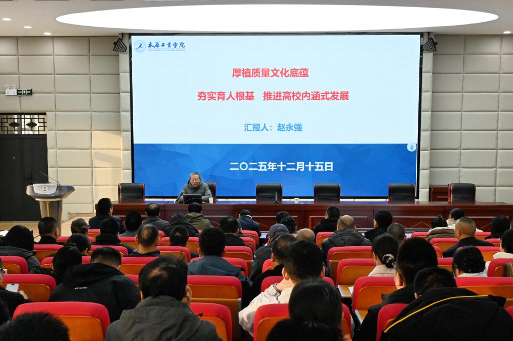 为持续提升本科办学水平,厚植质量文化底蕴,12月15日,我校开展专题讲座与本科合格评估专家咨询座谈会。太原工业学院教学质量监控部部长赵永强教授受邀出席,副校长李开明主持活动。学校相关职能处室工作人员、各学院领导班子成员及本科任课教师代表参与。