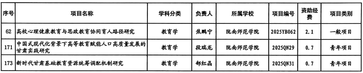 近日,甘肃省2025年度哲学社会科学规划项目立项结果正式公布。我校教师申报的三项课题成功获批,其中包括一般项目一项、青年项目两项,均为教育学学科领域,充分展现了我校在教育学科研领域的扎实积累与创新活力。