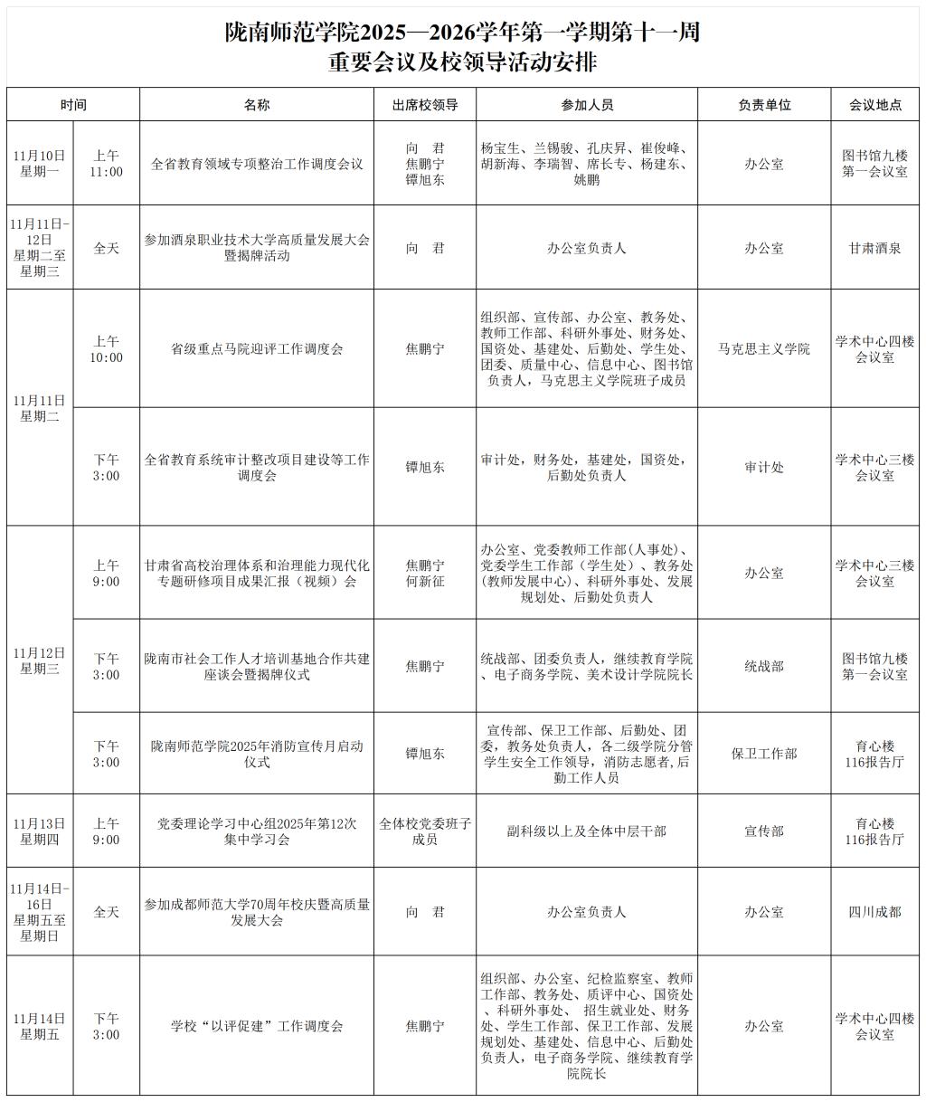 下一条:陇南师范学院2025—2026学年第一学期第十周重要会议及校领导活动安排