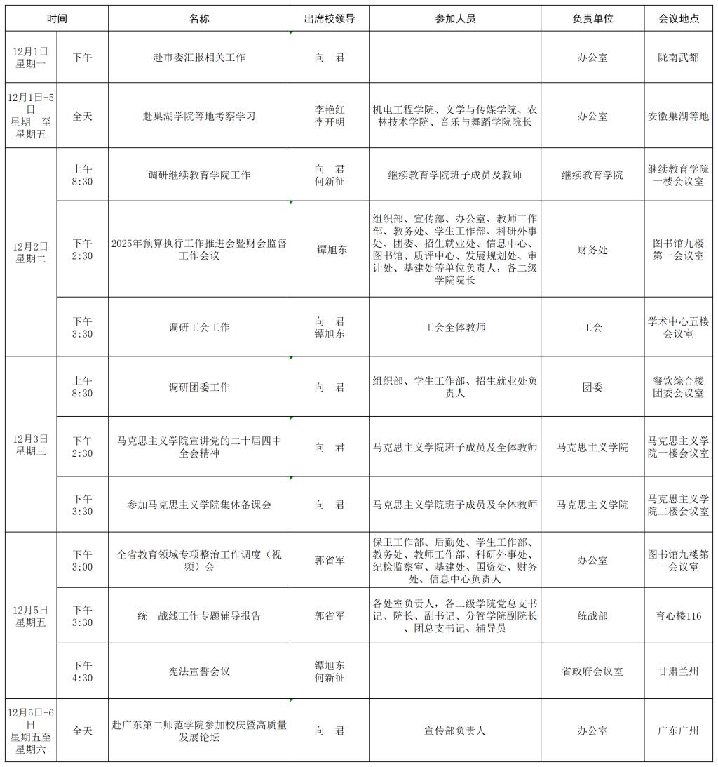 下一条:陇南师范学院2025—2026学年第一学期第十三周重要会议及校领导活动安排 重要会议及校领导活动安排