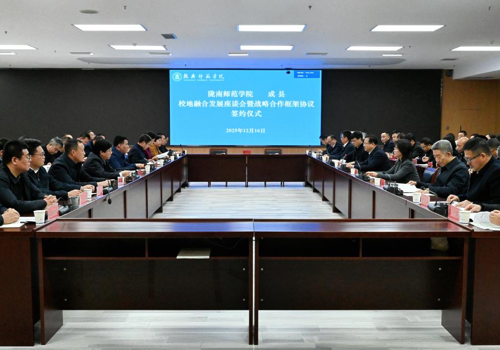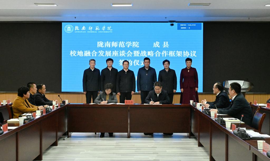 12月16日,学校与成县校地融合发展座谈会在我校召开。学校党委书记向君主持会议并致辞,成县县委书记王辉出席会议并讲话。党委副书记、校长李艳红与成县县委副书记、代县长冉彦清分别代表双方签署战略合作框架协议。成县人大常委会主任吴秀、政协主席纳康清,学校党委班子成员,成县相关单位和学校各处室、各学院负责人参加了会议。